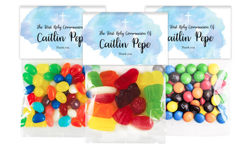 A Splash Of Watercolour Blue Communion Personalised Lolly Bag With Topper