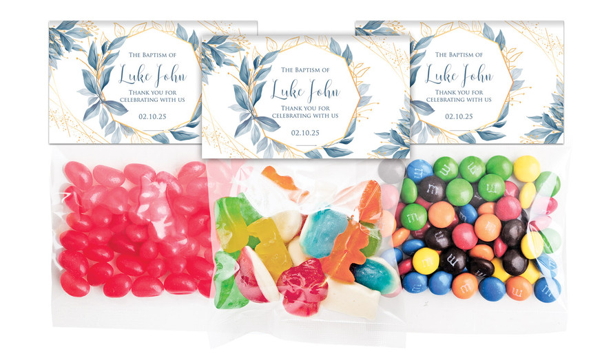 Blue Leaves Christening Personalised Lolly Bag With Topper
