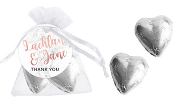 Celebrate your engagement in delicious and elegant style with Chocablock's classy range of personalised organza bags for engagement parties. Choose from a range of bag colours and chocolate heart foil colours and then add a personalised swing tag to make the favours all your own. Your guests will love them!