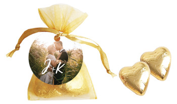 These bags come filled with 2 x foil chocolate hearts to symbolise the two hearts being joined together on your special day and are available in a choice of colours - your organza bags can also have different colour choices.