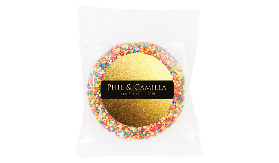 A beautiful design on board our fun-filled 8cm giant chocolate freckles makes for a perfect wedding favour. Add guest names too if you like to have these double as place card holders.